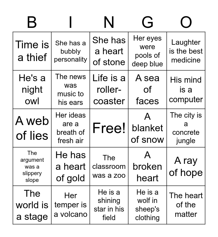 This bingo card has a free space and 24 words: He has a heart of gold, Her temper is a volcano, Life is a roller-coaster, The world is a stage, Laughter is the best medicine, Time is a thief, He's a night owl, She has a bubbly personality, A blanket of snow, The classroom was a zoo, A sea of faces, A web of lies, A broken heart, A ray of hope, The news was music to his ears, He is a wolf in sheep's clothing, The city is a concrete jungle, She has a heart of stone, His mind is a computer, Her ideas are a breath of fresh air, The heart of the matter, The argument was a slippery slope, Her eyes were pools of deep blue and He is a shining star in his field.