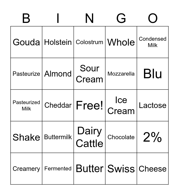 This bingo card has a free space and 50 words: Milk, Cheese, Yogurt, Butter, Buttermilk, Skim, Holstein, Horchata, Pasteurize, Oat, Almond, Whole, 2%, Chocolate, Strawberry, Cream, Sour Cream, Ice Cream, Whipped Cream, Condensed Milk, Cheddar, Swiss, Gouda, Mozzarella, Feta, Parmesan, Blu, Curd, Colostrum, Dairy Cattle, Soy, Dairy Farm, Milking, Cheesy, Fermented, Low-fat, Goat Milk, Goat Cheese, Evaporated Milk, Lactose, Lactose Intolerance, Cottage Cheese, Sour, Margarine, Creamery, Pasteurized Milk, Cereal, Calcium, Shake and Unpasteurized.