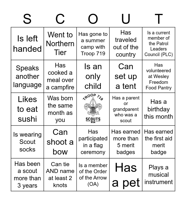 This bingo card has a free space and 24 words: Can shoot a bow, Can tie AND name at least 2 knots, Is an only child, Has been a scout more than 3 years, Is a current member of the Patrol Leaders Council (PLC), Is left handed, Speaks another language, Went to Northern Tier, Has a parent or grandparent who was a scout, Has participated in a flag ceremony, Can set up a tent, Likes to eat sushi, Has earned more than 5 merit badges, Has earned the first aid merit badge, Has cooked a meal over a campfire, Has a pet, Has a birthday this month, Has gone to a summer camp with Troop 719, Has volunteered at Wesley Freedom Food Pantry, Was born the same month as you, Plays a musical instrument, Is wearing Scout socks, Has traveled out of the country and Is a member of the Order of the Arrow (OA).