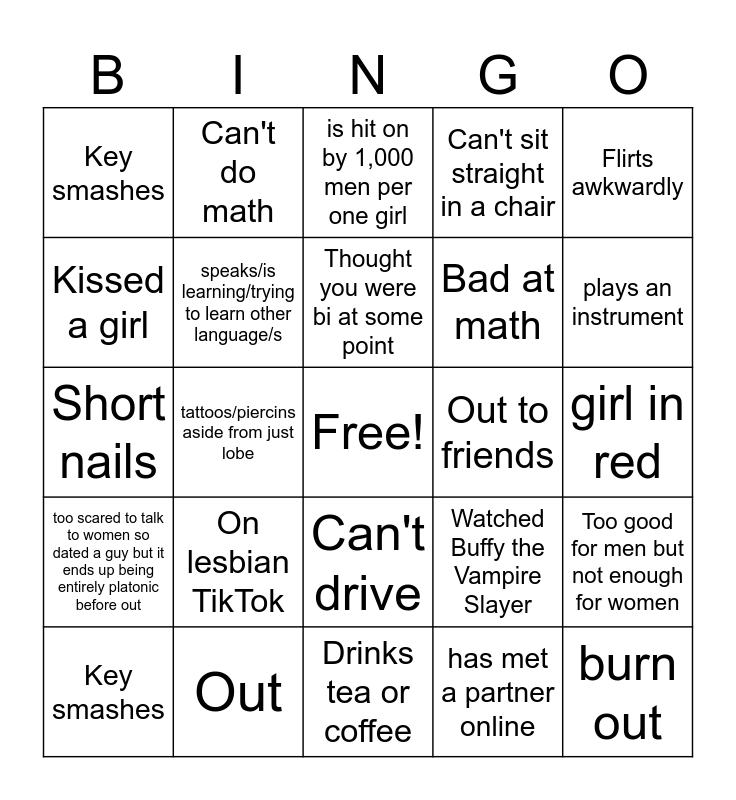 This bingo card has a free space and 24 words: On lesbian TikTok, Out, Thought you were bi at some point, Key smashes, Flirts awkwardly, Key smashes, Kissed a girl, Can't do math, Out to friends, Can't drive, Bad at math, Short nails, Watched Buffy the Vampire Slayer, Too good for men but not enough for women, speaks/is learning/trying to learn other language/s, has met a partner online, girl in red, is hit on by 1,000 men per one girl, plays an instrument, tattoos/piercins aside from just lobe, burn out, too scared to talk to women so dated a guy but it ends up being entirely platonic before out, Can't sit straight in a chair and Drinks tea or coffee.