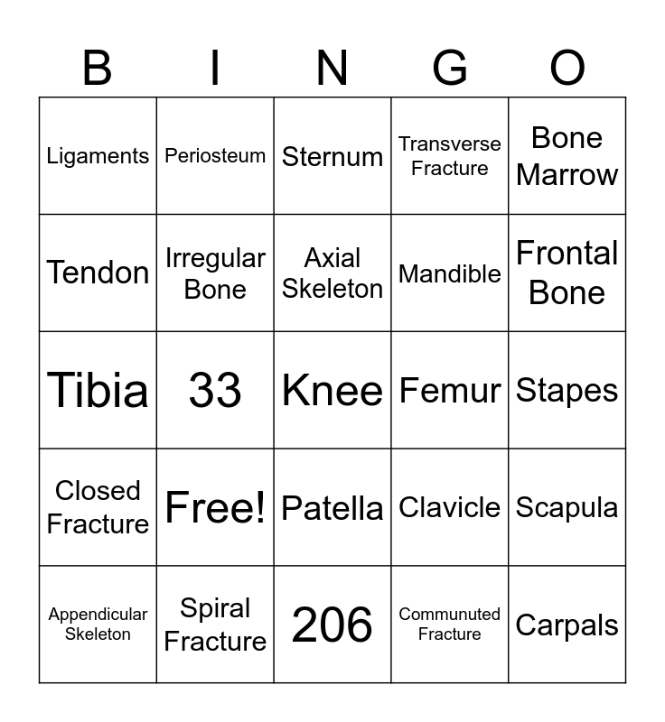 This bingo card has 25 words: Free!, 206, Axial Skeleton, Appendicular Skeleton, Bone Marrow, Ligaments, Tendon, Periosteum, Femur, Patella, Mandible, Tibia, Clavicle, Scapula, Irregular Bone, Carpals, Stapes, Sternum, Frontal Bone, 33, Knee, Spiral Fracture, Closed Fracture, Transverse Fracture and Communuted Fracture.