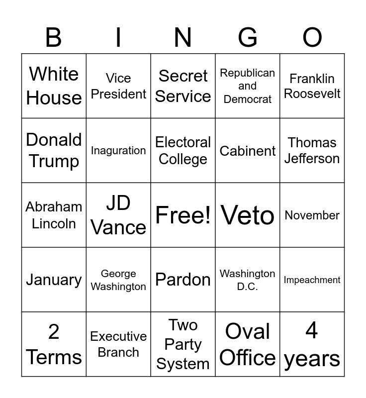This bingo card has a free space and 24 words: George Washington, Executive Branch, Electoral College, 2 Terms, Franklin Roosevelt, White House, Donald Trump, Vice President, Veto, Pardon, Cabinent, Abraham Lincoln, Washington D.C., Impeachment, Inaguration, Oval Office, November, Secret Service, Thomas Jefferson, JD Vance, 4 years, January, Republican and Democrat and Two Party System.