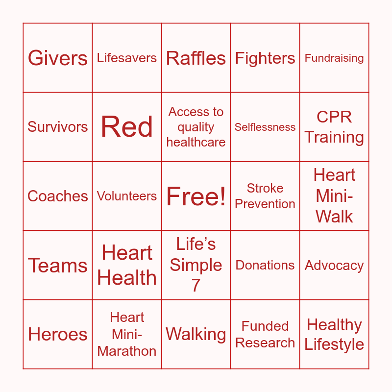 This bingo card has a free space and 29 words: Heroes, Generosity, Volunteers, Live!, Givers, Raffles, Red, Heart Health, Stroke Prevention, Heart Mini-Marathon, Heart Mini- Walk, Healthy Lifestyle, Walking, Funded Research, CPR Training, Go Red for Women, Life’s Simple 7, Teams, Fundraising, Coaches, Donations, Kindness, Selflessness, Survivors, Fighters, Lifesavers, Advocacy, Access to quality healthcare and AHA.