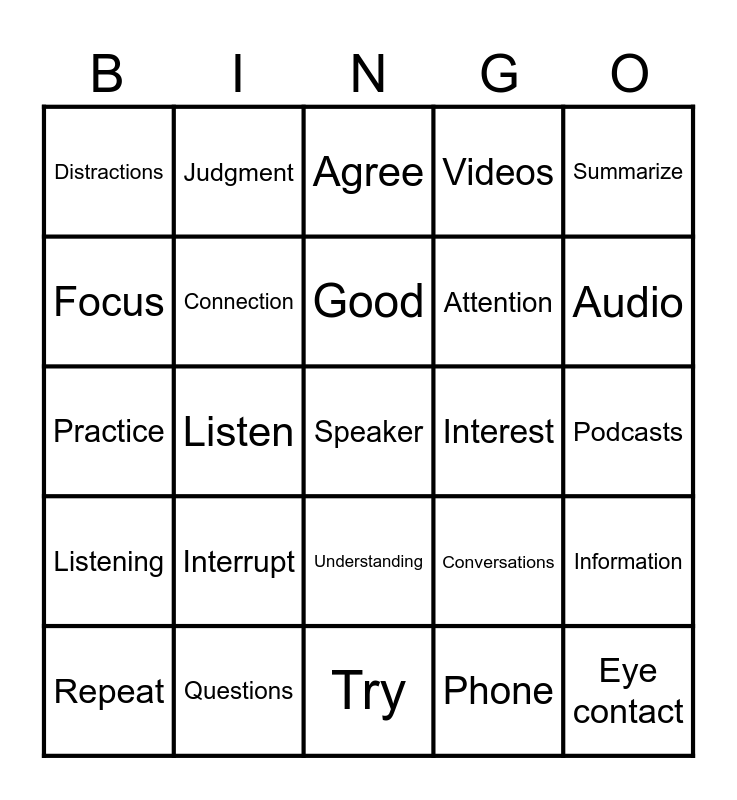 This bingo card has 25 words: Listening, Questions, Speaker, Phone, Summarize, Distractions, Judgment, Agree, Interest, Information, Focus, Connection, Try, Conversations, Audio, Repeat, Listen, Good, Attention, Podcasts, Practice, Interrupt, Understanding, Videos and Eye contact.