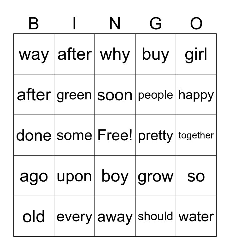 This bingo card has a free space and 31 words: away, now, some, today, way, why, green, grow, pretty, should, together, water, any, from, happy, once, so, upon, ago, boy, girl, how, old, after, people, after, buy, done, every, soon and work.