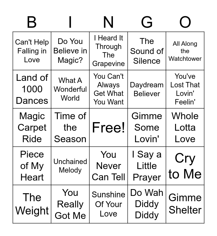 This bingo card has a free space and 40 words: Be My Baby, Magic Carpet Ride, You Can't Hurry Love, What A Wonderful World, You Really Got Me, You Never Can Tell, You Can't Always Get What You Want, Come A Little Bit Closer, All Along the Watchtower, Piece of My Heart, Time of the Season, The Sound of Silence, Gimme Shelter, Whole Lotta Love, Gimme Some Lovin', Unchained Melody, Can't Take My Eyes off You, Can't Help Falling in Love, I Got You Babe, I Heard It Through The Grapevine, Cry to Me, Do Wah Diddy Diddy, Daydream Believer, Land of 1000 Dances, (Your Love Keeps Lifting Me) Higher & Higher, The Wanderer, Hold On, I'm Comin', In the Ghetto, Bring It On Home to Me, Space Oddity, Let's Twist Again, The Weight, Somebody to Love, I Say a Little Prayer, You've Lost That Lovin' Feelin', Sunshine Of Your Love, Viva Las Vegas, For Once In My Life, Do You Believe in Magic? and God Only Knows.