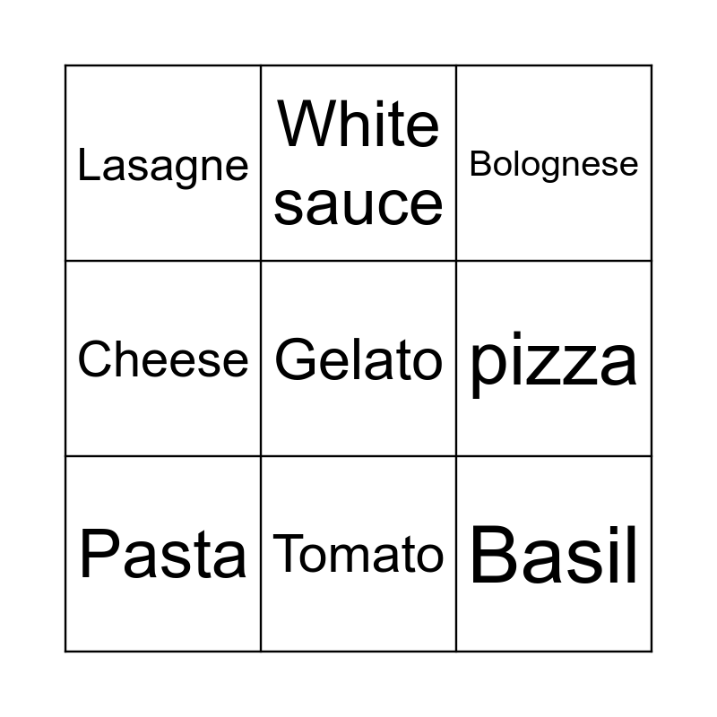 This bingo card has 9 words: Pasta, Bolognese, White sauce, Cheese, Lasagne, pizza, Gelato, Basil and Tomato.