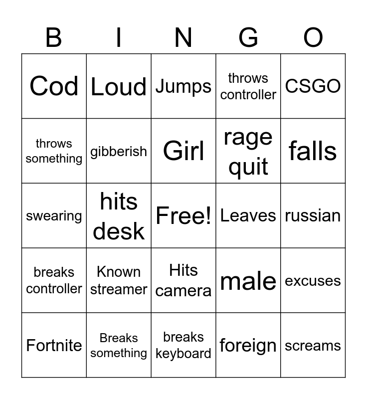 This bingo card has a free space and 24 words: Known streamer, Breaks something, Girl, Fortnite, CSGO, Cod, throws something, Loud, Leaves, Hits camera, rage quit, swearing, male, excuses, gibberish, foreign, russian, Jumps, falls, hits desk, screams, breaks controller, throws controller and breaks keyboard.