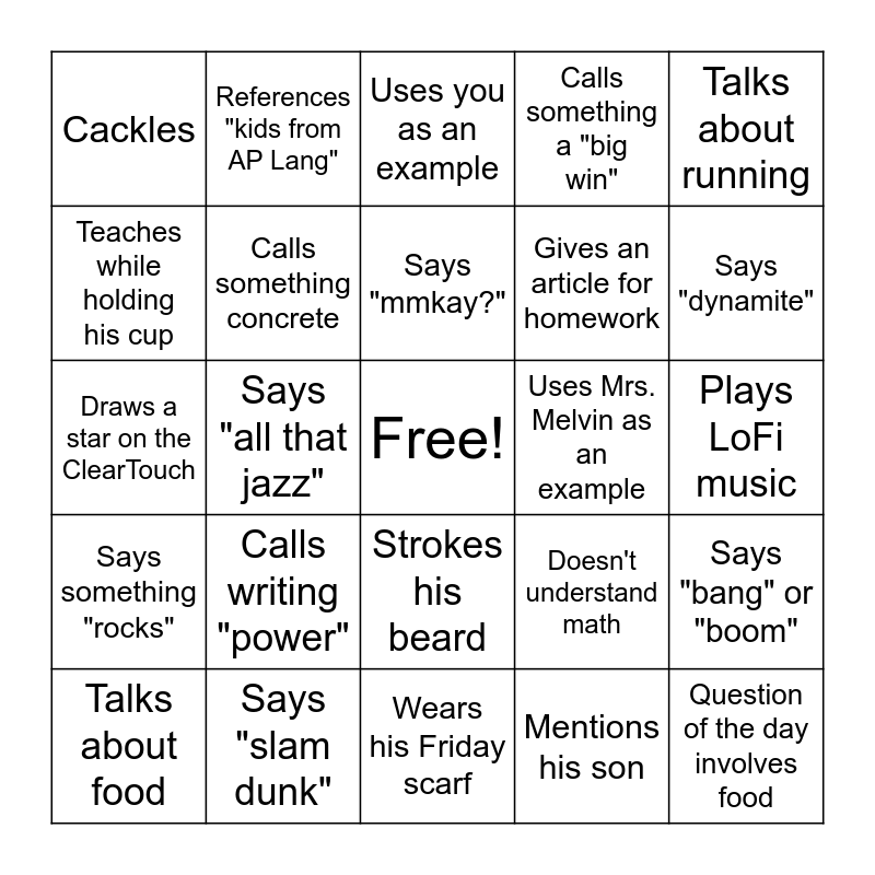 This bingo card has a free space and 24 words: Calls writing "power", Says "slam dunk", Says "mmkay?", Talks about food, Talks about running, Cackles, Teaches while holding his cup, References "kids from AP Lang", Uses Mrs. Melvin as an example, Strokes his beard, Gives an article for homework, Draws a star on the ClearTouch, Doesn't understand math, Says "bang" or "boom", Calls something concrete, Mentions his son, Plays LoFi music, Uses you as an example, Says "dynamite", Says "all that jazz", Question of the day involves food, Says something "rocks", Calls something a "big win" and Wears his Friday scarf.