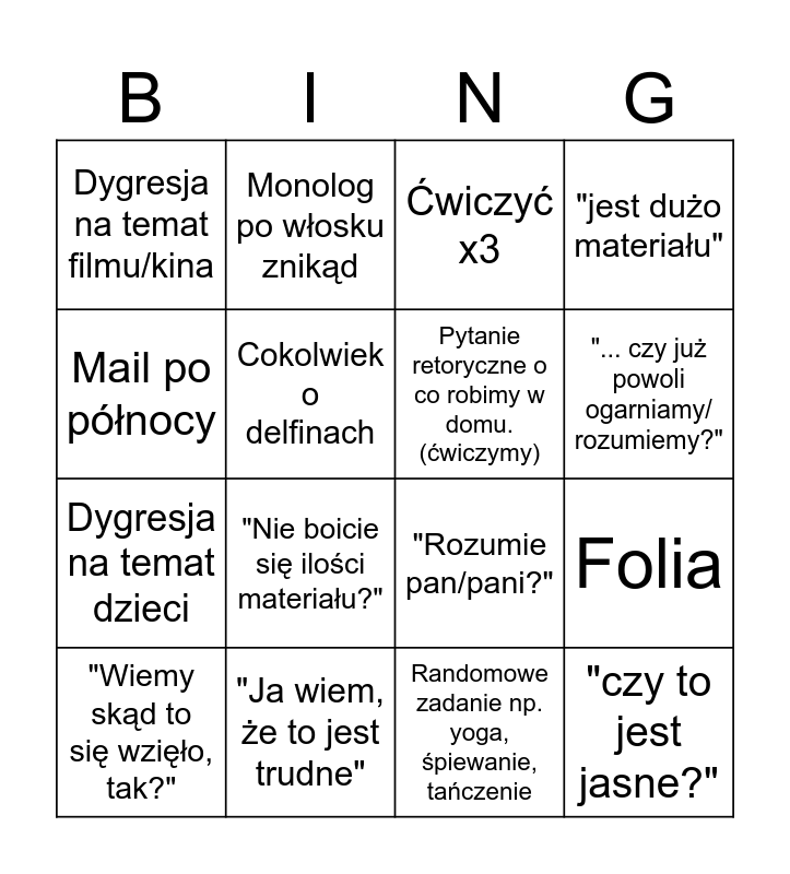 This bingo card has 16 words: "Ja wiem, że to jest trudne", Folia, Ćwiczyć x3, Dygresja na temat filmu/kina, Dygresja na temat dzieci, Monolog po włosku znikąd, "Rozumie pan/pani?", Randomowe zadanie np. yoga, śpiewanie, tańczenie, Mail po północy, Cokolwiek o delfinach, "Wiemy skąd to się wzięło, tak?", "jest dużo materiału", "Nie boicie się ilości materiału?", "... czy już powoli ogarniamy/ rozumiemy?", Pytanie retoryczne o co robimy w domu. (ćwiczymy) and "czy to jest jasne?".