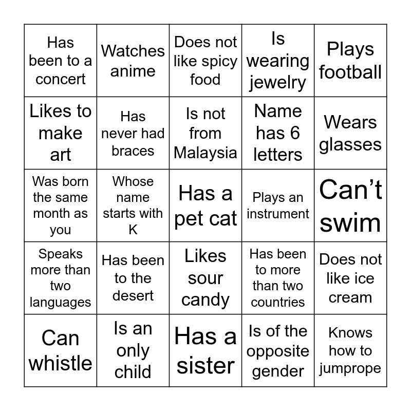 This bingo card has 25 words: Speaks more than two languages, Is an only child, Has a pet cat, Is of the opposite gender, Plays football, Has been to a concert, Watches anime, Does not like spicy food, Plays an instrument, Does not like ice cream, Likes to make art, Has never had braces, Has a sister, Has been to more than two countries, Wears glasses, Can whistle, Whose name starts with K, Is not from Malaysia, Name has 6 letters, Can’t swim, Was born the same month as you, Has been to the desert, Likes sour candy, Is wearing jewelry and Knows how to jumprope.