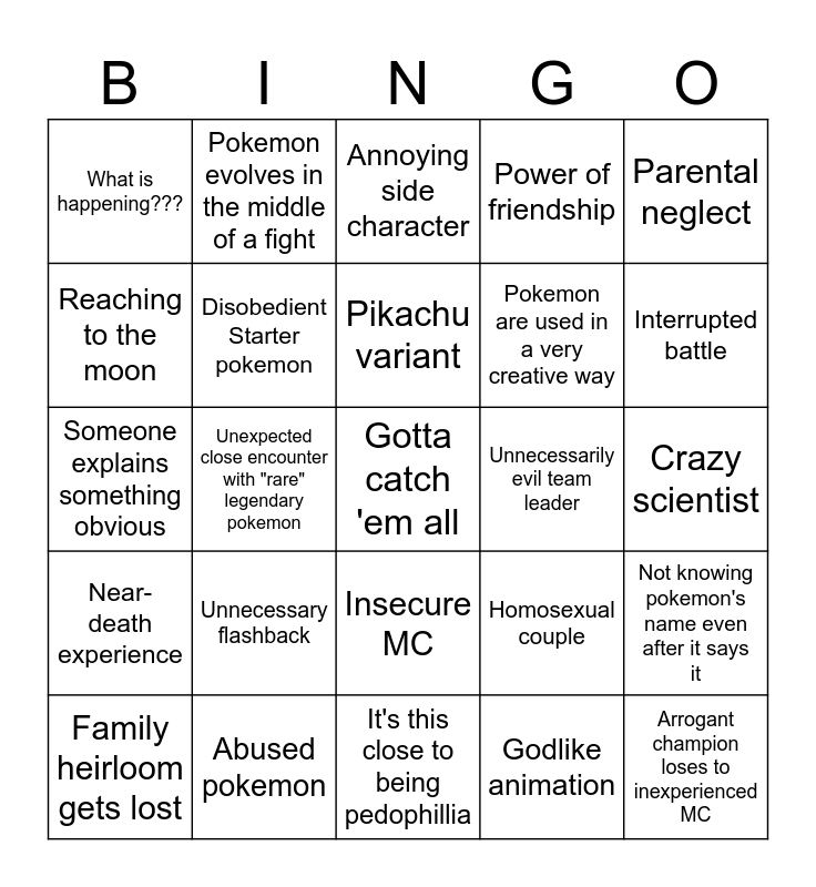 This bingo card has a free space and 36 words: Child endangerment, Legendary cameo, Aura farming, Disobedient Starter pokemon, Homosexual couple, Near-death experience, Pikachu variant, Team Rocket reappearing, Parental neglect, Region hopping, Unexpected close encounter with "rare" legendary pokemon, Power of friendship, Plot armour, Unnecessarily evil team leader, Interrupted battle, What is happening???, Catching a "low catch-rate" Pokemon with a pokeball, Unnecessary flashback, Arrogant champion loses to inexperienced MC, Annoying side character, Crazy scientist, Not knowing pokemon's name even after it says it, Abused pokemon, Family heirloom gets lost, It's this close to being pedophillia, Pokemon evolves in the middle of a fight, Someone explains something obvious, Subtitles spells Pokemon's name wrong, Pokemon are used in a very creative way, Reaching to the moon, Long-winded speech to the villains about how pokemon are our friends, Characters reference how all nurse joys/officer jennys look the same, Godlike animation, Insecure MC, Gets attacked by wild pokemon and "The Chosen one".