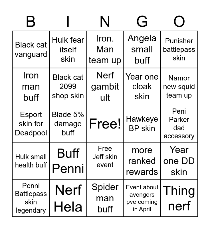 This bingo card has a free space and 24 words: Buff Penni, Nerf Hela, Nerf gambit ult, Penni Battlepass skin legendary, Punisher battlepass skin, Black cat vanguard, Iron man buff, Hulk fear itself skin, Hawkeye BP skin, Free Jeff skin event, Year one cloak skin, Esport skin for Deadpool, more ranked rewards, Year one DD skin, Black cat 2099 shop skin, Event about avengers pve coming in April, Peni Parker dad accessory, Iron. Man team up, Namor new squid team up, Blade 5% damage buff, Thing nerf, Hulk small health buff, Angela small buff and Spider man buff.