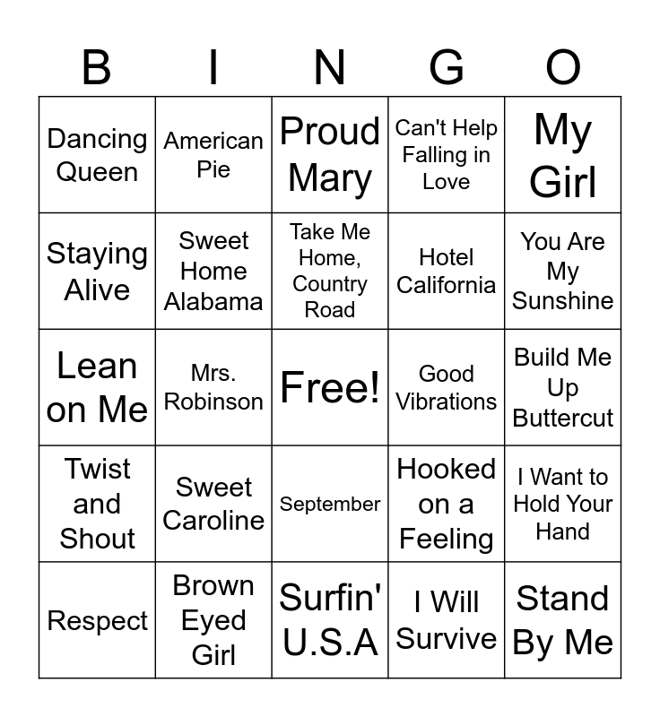 This bingo card has a free space and 24 words: Sweet Caroline, Brown Eyed Girl, Take Me Home, Country Road, Respect, My Girl, Dancing Queen, Staying Alive, American Pie, Good Vibrations, September, Hotel California, Lean on Me, Hooked on a Feeling, I Want to Hold Your Hand, Sweet Home Alabama, I Will Survive, Build Me Up Buttercut, Proud Mary, You Are My Sunshine, Mrs. Robinson, Stand By Me, Twist and Shout, Can't Help Falling in Love and Surfin' U.S.A.