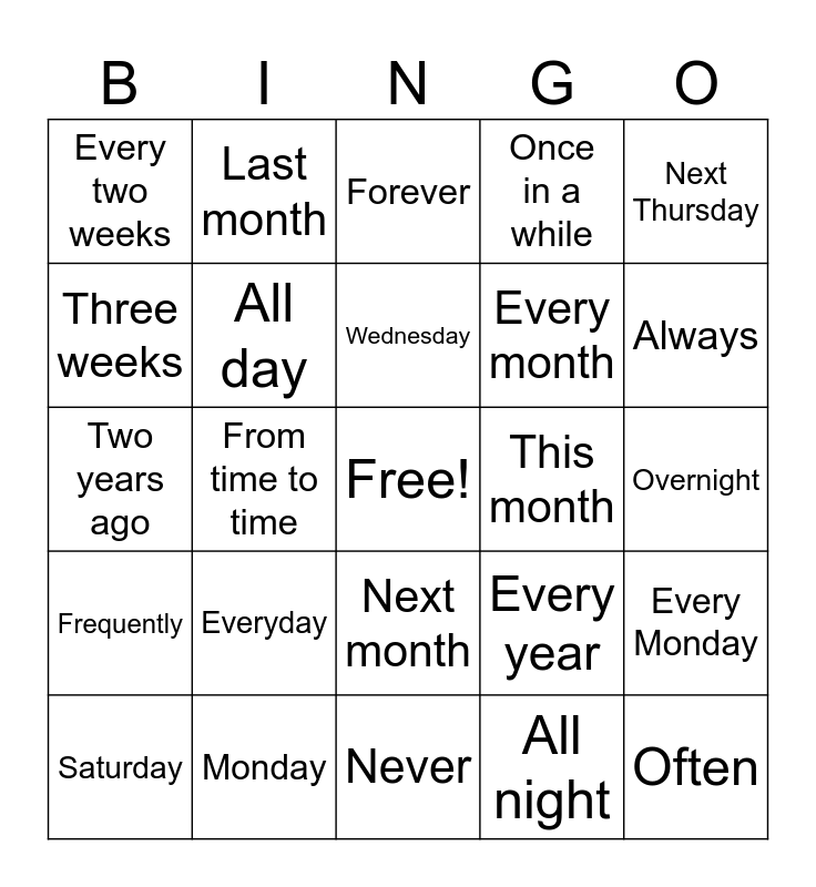 This bingo card has a free space and 24 words: Everyday, Monday, Wednesday, Saturday, Next Thursday, Every two weeks, Three weeks, Last month, This month, Next month, Every month, Two years ago, Every year, Every Monday, All day, All night, Overnight, Forever, Always, From time to time, Often, Frequently, Once in a while and Never.