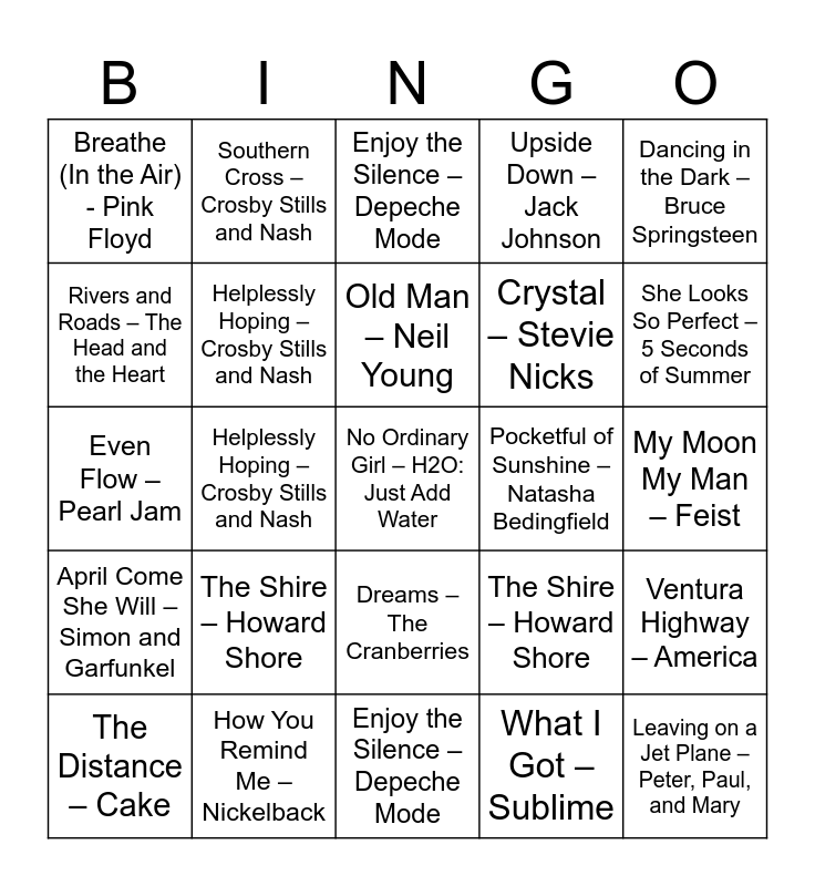 ⚠ This card has duplicate items: Once in a Lifetime – Talking Heads (2), What a Day That Was – Talking Heads (2), The Wreck of the Edmund Fitzgerald – Gordon Lightfoot (2), The Shire – Howard Shore (2), Rivers and Roads – The Head and the Heart (2), Cleopatra – The Lumineers (3), Whiskey – Trampled by Turtles (2), Duluth – Trampled by Turtles (2), Wait so Long – Trampled by Turtles (2), Meet Me in the Woods – Lord Huron (2), Caribbean Blue – Enya (2), Orinocco Flow – Enya (2), What I Got – Sublime (2), Santeria – Sublime (2), Hurricane – Bridgit Mendler (2), Listen to the Music – Doobie Brothers (2), Ventura Highway – America (2), Hippies and Cowboys – Cody Jinks (2), Some Day I’ll Be a Farmer – Melanie (2), People in the Front Row – Melanie (2), Helplessly Hoping – Crosby Stills and Nash (2), Southern Cross – Crosby Stills and Nash (2), Vienna – Billy Joel (2), Fake Plastic Trees – Radiohead (2), Nutshell – Alice in Chains (2), Wuthering Heights – Kate Bush (2), My Moon My Man – Feist (2), River – Leon Bridges (2), Get Lucky – Daft Punk (2), Old Man – Neil Young (2), Delete Ya – Djo (2), Crystal – Stevie Nicks (2), Kiss from a Rose – Seal (2), i like this – Joey Valance & Brae (2), HOOLIGANG – Joey Valance & Brae (2), Dreams – The Cranberries (2), Upside Down – Jack Johnson (2), Teenage Dirtbag - Wheatus (2), Even Flow – Pearl Jam (2), Free Bird – Lynyrd Skynyrd (2), Exile – Taylor Swift, Bon Iver (2), Fortnight – Taylor Swift (2), You’re On Your Own Kid – Taylor Swift (2), Underground – Cody Fry (2), The Distance – Cake (2), Champagne Supernova – Oasis (2), Buddy Holly – Weezer (2), How You Remind Me – Nickelback (2), April Come She Will – Simon and Garfunkel (2), Blue Ridge Mountains – Fleet Foxes (2), All The Things She Said – t.A.T.u. (2), California – Joni Mitchell (2), Dancing in the Dark – Bruce Springsteen (2), Enjoy the Silence – Depeche Mode (2), Leaving on a Jet Plane – Peter, Paul, and Mary (2), Poker Face – Lady Gaga (2), Lay All Your Love on Me – ABBA (2), Waterfalls – TLC (2), Pocketful of Sunshine – Natasha Bedingfield (2), No Control – One Direction (2), She Looks So Perfect – 5 Seconds of Summer (2), The Climb – Miley Cyrus (2), Hoedown Throwdown – Miley Cyrus (3), Breathe (In the Air) - Pink Floyd (2), Paranoid – Black Sabbath (2), No Ordinary Girl – H2O: Just Add Water (2)