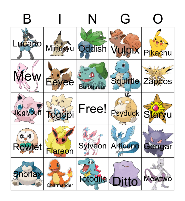 This bingo card has 24 images, a free space and 24 words: Flareon, Charmander, Bulbasaur, Snorlax, Pikachu, Lucario, Mew, Mimikyu, Psyduck, Sylveon, Squirtle, Jigglypuff, Articuno, Gengar, Eevee, Ditto, Staryu, Oddish, Zapdos, Togepi, Mewtwo, Rowlet, Vulpix and Totodile.
