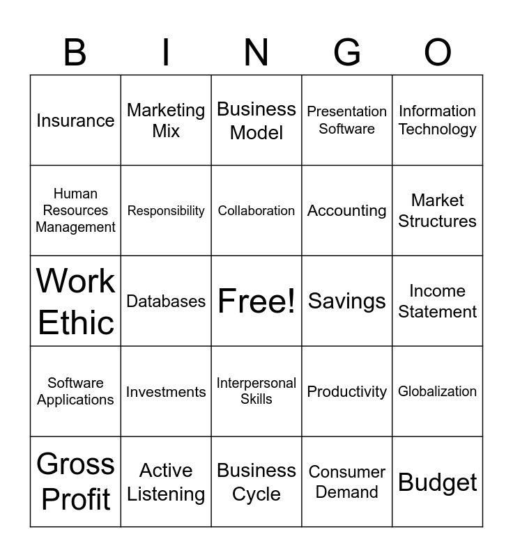 This bingo card has a free space and 40 words: Employability Skills, Work Ethic, Accountability, Responsibility, Active Listening, Interpersonal Skills, Collaboration, Leadership, Information Technology, Software Applications, Databases, Presentation Software, Budget, Income Statement, Savings, Investments, Credit Rating, Insurance, Financial Resources, Business Model, Globalization, Consumer Demand, Accounting, Human Resources Management, Marketing, Supply Chain Management, Operations Management, Logistics, Economic Resources, Economic Systems, Market Economy, Gross Profit, Net Profit, Productivity, Market Structures, Business Cycle, Risk Management, Consumer Protection, Marketing Mix and Accounting Equation.