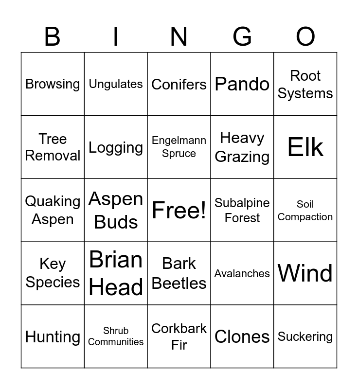 This bingo card has a free space and 25 words: Brian Head, Corkbark Fir, Engelmann Spruce, Hunting, Root Systems, Browsing, Tree Removal, Ungulates, Subalpine Forest, Bark Beetles, Heavy Grazing, Quaking Aspen, Avalanches, Wind, Logging, Ski Resorts, Soil Compaction, Conifers, Elk, Aspen Buds, Suckering, Shrub Communities, Key Species, Pando and Clones.