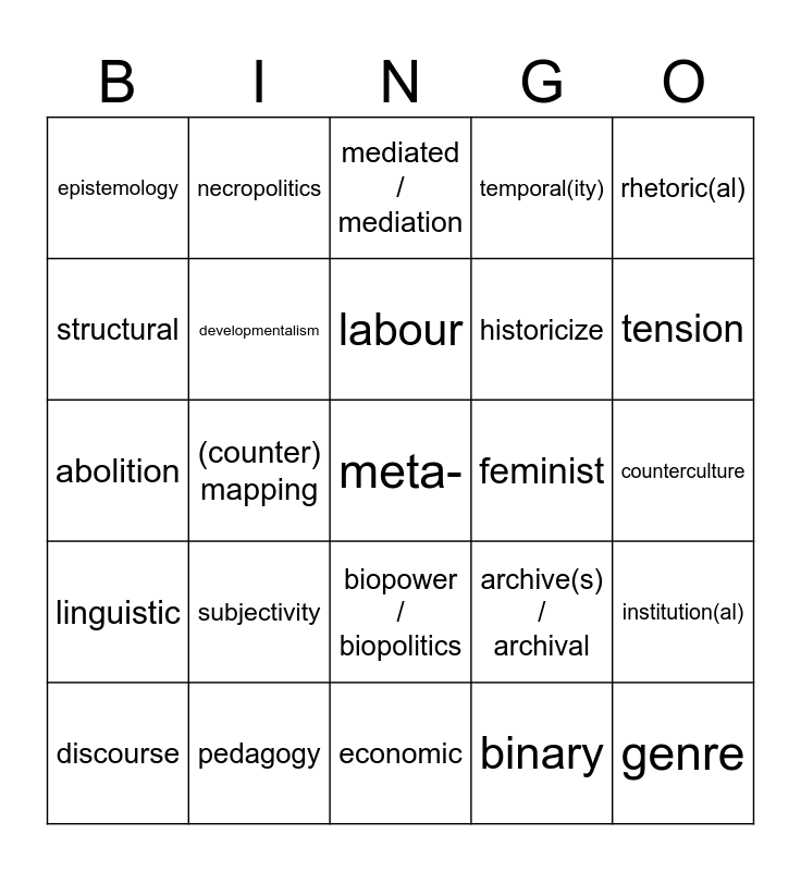 This bingo card has a free space and 24 words: subjectivity, pedagogy, labour, discourse, rhetoric(al), epistemology, structural, necropolitics, feminist, biopower / biopolitics, historicize, abolition, archive(s) / archival, institution(al), developmentalism, binary, counterculture, mediated / mediation, tension, (counter) mapping, genre, linguistic, temporal(ity) and economic.