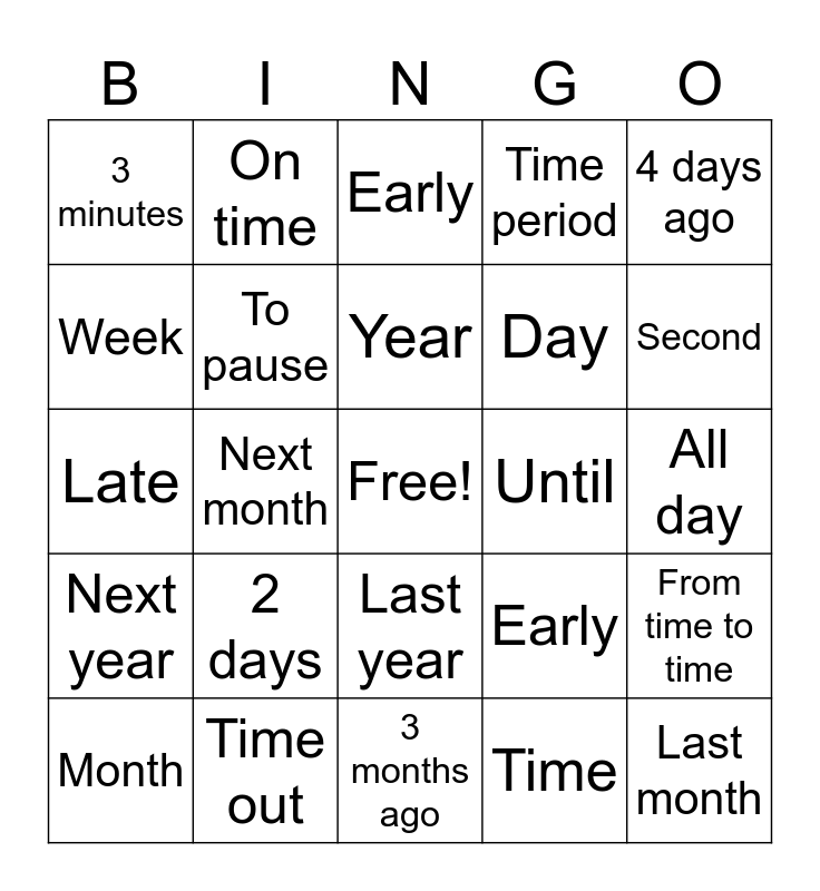 This bingo card has a free space and 24 words: 2 days, Time out, Year, Month, 4 days ago, 3 minutes, Week, On time, Until, Last year, Day, Late, Early, From time to time, To pause, Time, All day, Early, Second, Next month, Last month, Next year, Time period and 3 months ago.