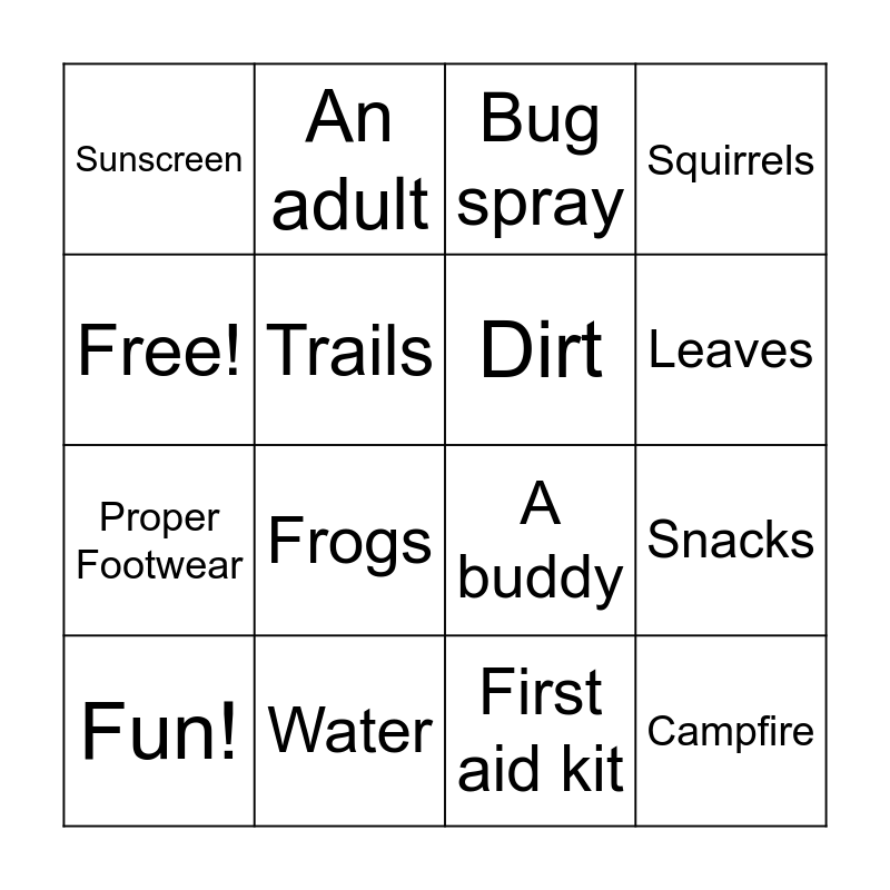 This bingo card has 16 words: Water, Snacks, Bug spray, Sunscreen, Proper Footwear, An adult, A buddy, First aid kit, Free!, Trails, Fun!, Squirrels, Frogs, Leaves, Dirt and Campfire.