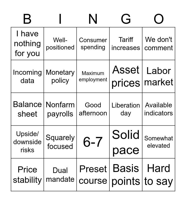 This bingo card has a free space and 24 words: Squarely focused, Dual mandate, Maximum employment, Price stability, We don't comment, I have nothing for you, Incoming data, Well-positioned, Liberation day, 6-7, Asset prices, Balance sheet, Solid pace, Somewhat elevated, Monetary policy, Basis points, Available indicators, Consumer spending, Labor market, Nonfarm payrolls, Hard to say, Upside/ downside risks, Tariff increases and Preset course.