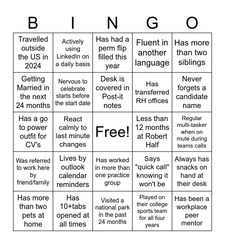 This bingo card has a free space and 24 words: Lives by outlook calendar reminders, Has 10+tabs opened at all times, Desk is covered in Post-it notes, Has more than two pets at home, Has more than two siblings, Travelled outside the US in 2024, Getting Married in the next 24 months, Actively using LinkedIn on a daily basis, Less than 12 months at Robert Half, Has worked in more than one practice group, Has transferred RH offices, Has a go to power outfit for CV's, Says "quick call" knowing it won't be, Always has snacks on hand at their desk, Nervous to celebrate starts before the start date, Played on their college sports team for all four years, Regular multi-tasker when on mute during teams calls, Has had a perm flip filled this year, Never forgets a candidate name, React calmly to last minute changes, Has been a workplace peer mentor, Was referred to work here by friend/family, Fluent in another language and Visited a national park in the past 24 months.