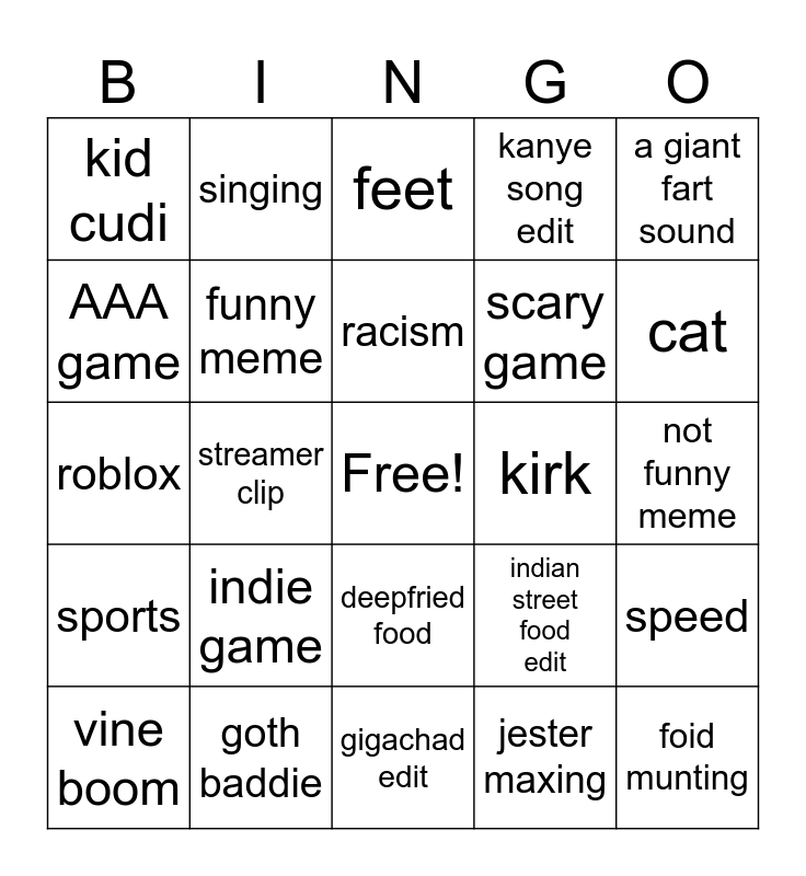 This bingo card has a free space and 24 words: indie game, goth baddie, racism, vine boom, a giant fart sound, kid cudi, AAA game, singing, kirk, deepfried food, scary game, roblox, indian street food edit, speed, funny meme, jester maxing, not funny meme, feet, cat, streamer clip, foid munting, sports, kanye song edit and gigachad edit.