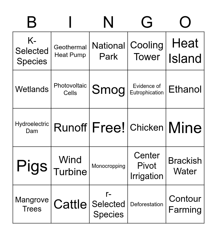 This bingo card has a free space and 24 words: Wind Turbine, Cattle, Smog, Mangrove Trees, Heat Island, K-Selected Species, Wetlands, Geothermal Heat Pump, Chicken, Monocropping, Evidence of Eutrophication, Hydroelectric Dam, Center Pivot Irrigation, Brackish Water, Photovoltaic Cells, Deforestation, Mine, National Park, Ethanol, Runoff, Contour Farming, Pigs, Cooling Tower and r-Selected Species.