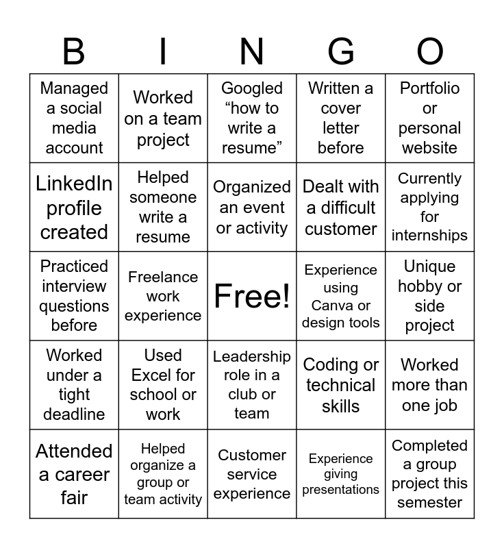 This bingo card has a free space and 48 words: Worked a part-time job, Completed a group project this semester, Volunteer experience on a resume, Customer service experience, Used Excel for school or work, Experience speaking in front of a group, Worked on a team project, Applied to a job this year, LinkedIn profile created, Attended a networking event, Helped someone write a resume, Written a cover letter before, Worked more than one job, Coding or technical skills, Research experience with a professor, Tutoring experience, Organized an event or activity, Experience using Canva or design tools, Built a personal project, Portfolio or personal website, Freelance work experience, Experience giving presentations, Managed a social media account, Dealt with a difficult customer, Completed an internship, Currently applying for internships, Attended a career fair, Learned a new skill this year, Leadership role in a club or team, Worked under a tight deadline, Collaborated with students from different majors, PowerPoint experience, Experience using Google Docs for teamwork, Solved a difficult problem in a project, Helped organize a group or team activity, Skill not related to your major, Learned something outside class that helped career goals, Unique hobby or side project, Experience mentoring someone, Pulled an all-nighter for a deadline, Sent more than 10 job applications, Rewritten a resume multiple times, Googled “how to write a resume”, Procrastinated on job applications, Practiced interview questions before, Watched career advice videos, Came across a reel on resume advice and Used AI for resume help.