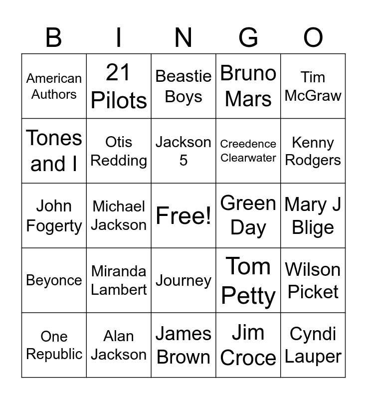 This bingo card has a free space and 24 words: Miranda Lambert, Alan Jackson, Jackson 5, One Republic, Tim McGraw, American Authors, Tones and I, 21 Pilots, Green Day, Journey, Creedence Clearwater, John Fogerty, Tom Petty, Wilson Picket, Otis Redding, Jim Croce, Mary J Blige, Beastie Boys, Kenny Rodgers, Michael Jackson, Cyndi Lauper, Beyonce, Bruno Mars and James Brown.