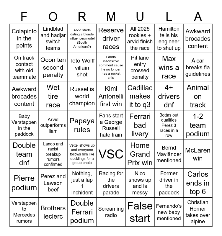 This bingo card has 49 words: Former driver in the paddock, Max wins a race, False start, Arvid outperforms liam, Russel is world champion, 1-2 team podium, Lindblad and hadjar switch teams, Double Ferrari podium, Hamilton tells his engineer to shut up, VSC, Awkward brocades content, Reserve driver races, 4+ drivers dnf, Cadillac makes it to q3, Perez and Lawson beef, Bottas out qualifies Perez 3 races in a row, On track contact with old teammate, A car breaks fia guidelines, Carlos ends in top 6, All 2025 rookies + arvid finish the race, Pit lane entry crossed penalty, Papaya rules, Colapinto in the points, Ocon ten second penalty, Verstappen to Mercedes rumors, Toto Wolff villain shot, Animal on track, Brothers leclerc, Kimi Antonelli first win, Wet tire race, Christian Horner takes over alpine, Ferrari bad livery, Pierre podium, Nothing, just a lap 1 inchident, Baby Verstappen in the paddock, Home Grand Prix win, Bernd Mayländer mentioned, McLaren win, Awkward brocades content, Vettel shows up and everyone follows him like ducklings for a group photo, Racing for the drivers parade, Double team dnf, Fans start a George Russell hate train, Screaming radio, Lando insensitive comment cause he no longer has a rocket ship, Arvid starts dating a blonde influencer/model (South American?), Nico shows up and is messy, Lando and racist breakup rumors confirmed and Fernando’s new baby mentioned.