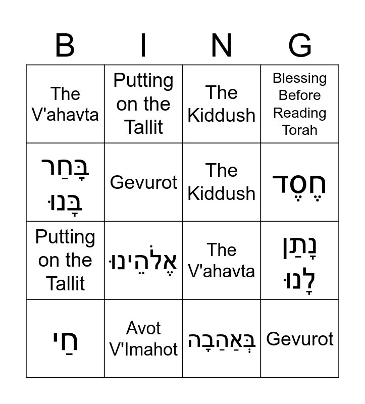 This bingo card has 22 words: Avot V'Imahot, Blessing Before Reading Torah, Putting on the Tallit, Free!, Gevurot, The Kiddush, The V'ahavta, The Kiddush, The V'ahavta, Gevurot, Putting on the Tallit, Blessing Before Reading Torah, Avot V'Imahot, בָּחַר בָּנוּ, בְּאַהַבָה, קֹדֶשׂ, נָתַן לָנוּ, חַי, אֶלֹהֵינוּ, בָּחַר בָּנוּ, חֶסֶד and בְּרַכוֹת.