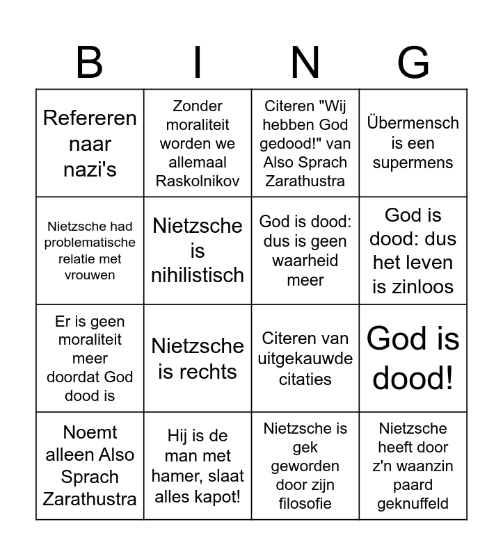 This bingo card has 16 words: Hij is de man met hamer, slaat alles kapot!, God is dood!, Citeren "Wij hebben God gedood!" van Also Sprach Zarathustra, Refereren naar nazi's, Er is geen moraliteit meer doordat God dood is, Zonder moraliteit worden we allemaal Raskolnikov, Citeren van uitgekauwde citaties, Nietzsche is gek geworden door zijn filosofie, Nietzsche had problematische relatie met vrouwen, Nietzsche is nihilistisch, Noemt alleen Also Sprach Zarathustra, Übermensch is een supermens, Nietzsche is rechts, God is dood: dus het leven is zinloos, God is dood: dus is geen waarheid meer and Nietzsche heeft door z'n waanzin paard geknuffeld.