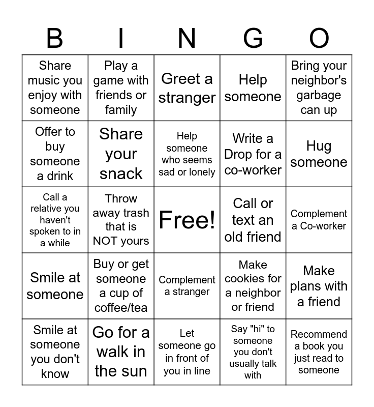 This bingo card has a free space and 29 words: Smile at someone you don't know, Complement a friend, Throw away trash that is NOT yours, Introduce yourself to someone you don't know, Share music you enjoy with someone, Greet a stranger, Share your snack, Buy or get someone a cup of coffee/tea, Call or text an old friend, Go for a walk in the sun, Complement a Co-worker, Recommend a book you just read to someone, Let someone go in front of you in line, Say "hi" to someone you don't usually talk with, Hug someone, Take your dog for a walk, Complement a stranger, Smile at someone, Bring your neighbor's garbage can up, Call a relative you haven't spoken to in a while, Make cookies for a neighbor or friend, Tell someone about a movie or podcast you enjoyed, Write a Drop for a co-worker, Offer to buy someone a drink, Help someone, Play a game with friends or family, Make plans with a friend, Help someone who seems sad or lonely and Tell a family member how much you love them.