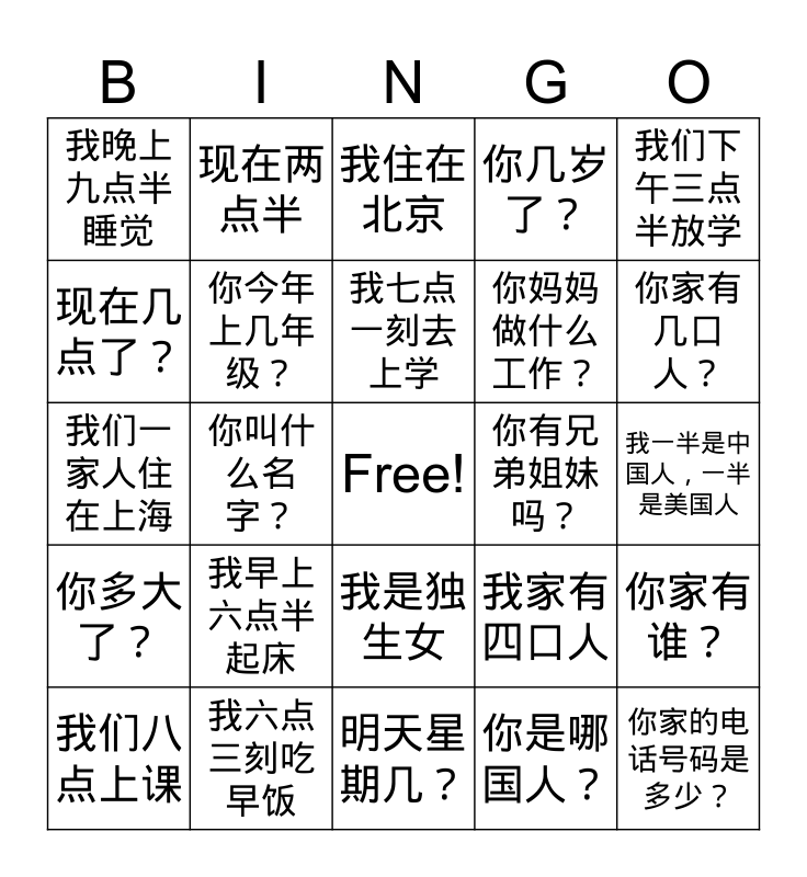 This bingo card has a free space and 24 words: 我早上六点半起床, 我六点三刻吃早饭, 我七点一刻去上学, 我们八点上课, 我们下午三点半放学, 我晚上九点半睡觉, 现在几点了?, 现在两点半, 你有兄弟姐妹吗?, 我是独生女, 你妈妈做什么工作?, 我们一家人住在上海, 我家有四口人, 你家有谁?, 你今年上几年级?, 你是哪国人?, 我一半是中国人,一半是美国人, 我住在北京, 你家有几口人?, 你叫什么名字?, 你家的电话号码是多少?, 你多大了?, 你几岁了? and 明天星期几?.