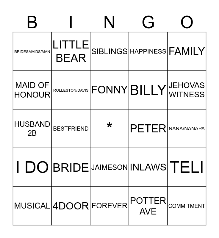 This bingo card has a free space and 24 words: BRIDE, 4DOOR, FONNY, MUSICAL, FAMILY, BRIDESMAIDS/MAN, MAID OF HONOUR, LITTLE BEAR, PETER, JAIMESON, BILLY, HUSBAND 2B, INLAWS, TELI, ROLLESTON/DAVIS, POTTER AVE, NANA/NANAPA, SIBLINGS, JEHOVAS WITNESS, BESTFRIEND, COMMITMENT, I DO, HAPPINESS and FOREVER.