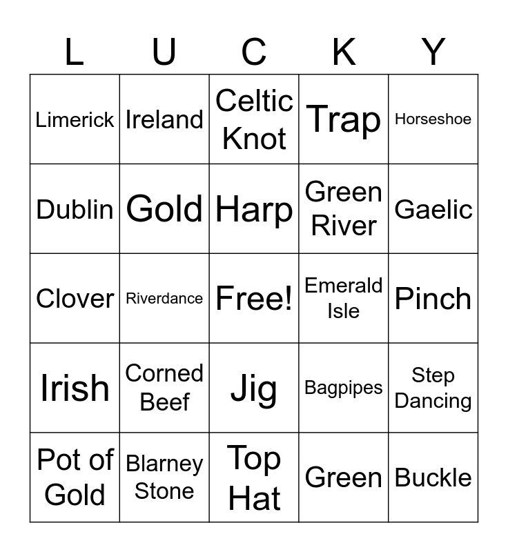 This bingo card has a free space and 34 words: Rainbow, Green, Shamrock, Leprechaun, Irish, Gold, Horseshoe, Pot of Gold, Ireland, Lucky Charms, Harp, Celtic Knot, St. Patrick, Fiddle, Emerald Isle, Gaelic, Blarney Stone, Clover, Corned Beef, Bagpipes, Jig, Luck, Limerick, Pinch, Top Hat, Buckle, Trap, Wish, Green River, Dublin, Soda Bread, Riverdance, Step Dancing and Mischief.