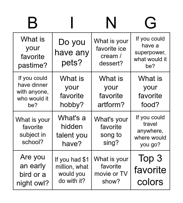 This bingo card has 16 words: If you had $1 million, what would you do with it?, If you could travel anywhere, where would you go?, What is your favorite ice cream / dessert?, What is your favorite pastime?, What is your favorite subject in school?, Do you have any pets?, What's your favorite song to sing?, What is your favorite movie or TV show?, If you could have dinner with anyone, who would it be?, What is your favorite hobby?, Are you an early bird or a night owl?, If you could have a superpower, what would it be?, What's a hidden talent you have?, What is your favorite food?, What is your favorite artform? and Top 3 favorite colors.