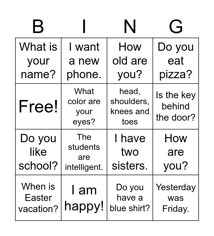 This bingo card has 16 words: I am happy!, How are you?, How old are you?, What is your name?, Do you like school?, I want a new phone., I have two sisters., Do you have a blue shirt?, Free!, What color are your eyes?, When is Easter vacation?, Do you eat pizza?, The students are intelligent., Is the key behind the door?, head, shoulders, knees and toes and Yesterday was Friday..
