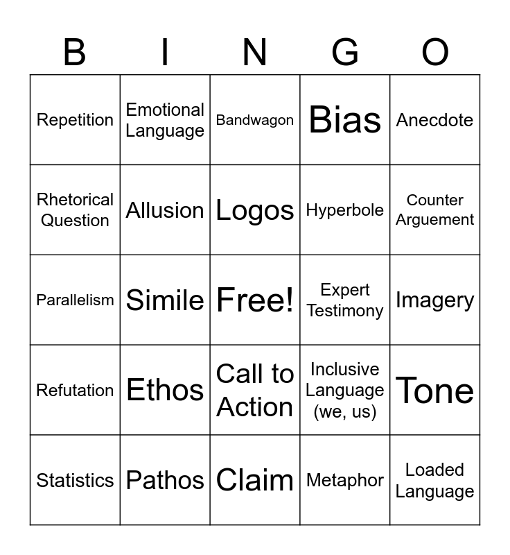 This bingo card has a free space and 24 words: Ethos, Pathos, Logos, Statistics, Anecdote, Repetition, Rhetorical Question, Emotional Language, Expert Testimony, Call to Action, Hyperbole, Parallelism, Inclusive Language (we, us), Tone, Allusion, Metaphor, Imagery, Bandwagon, Counter Arguement, Simile, Loaded Language, Refutation, Bias and Claim.