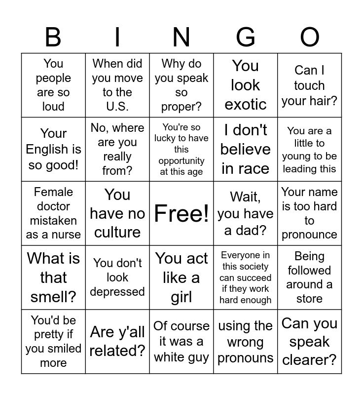 This bingo card has a free space and 24 words: You don't look depressed, Are y'all related?, You're so lucky to have this opportunity at this age, You'd be pretty if you smiled more, Can I touch your hair?, You people are so loud, Your English is so good!, When did you move to the U.S., Wait, you have a dad?, You act like a girl, I don't believe in race, Female doctor mistaken as a nurse, Everyone in this society can succeed if they work hard enough, Being followed around a store, No, where are you really from?, using the wrong pronouns, Your name is too hard to pronounce, Why do you speak so proper?, You are a little to young to be leading this, You have no culture, Can you speak clearer?, What is that smell?, You look exotic and Of course it was a white guy.