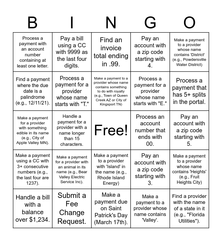 This bingo card has a free space and 83 words: Find a payment with 3 or more consecutive digits (e.g., 123 or 678)., Spot an account number with 20+ digits., Find an invoice total ending in .99., Spot a payment with an exact dollar amount (no cents)., Make a payment under $5., Make a payment over $50,000., Match an account number with a palindrome (e.g., 12321)., Find a payment with more than 3 zeroes in the total., Process a payment for an account number starting with 5., Find a payment dated in the same month and year as today., Make a payment for an account number with 3+ repeating digits (e.g., 555)., Make a payment with an even dollar amount (no odd cents)., Process a payment for a provider whose name starts with "T.", Process an account number that ends with 00., Pay an account number with exactly 8 digits., Process a payment with an account number containing at least one letter., Handle a bill with a balance over $1,234., Find a payment where the due date is a palindrome (e.g., 12/11/21)., Pay an account number that contains all EVEN digits (e.g., 48202)., Make a payment for a provider whose name contains 'City'., Process a payment for a provider whose name starts with "A.", Process a payment for a provider whose name starts with "E.", Find a provider with the name of a state in it (e.g., "Florida Utilities")., Pay a provider whose name contains a number., Handle a payment for a provider with a name longer than 15 characters., Process a bill for a provider whose name includes "National.", Find a provider name that contains the word "Energy" or "Power.", Process a payment for a provider in Utah., Process a payment for a provider located in Alabama., Process an account number with 15+ digits., Make a payment for a provider with an animal in its name (e.g., Bear Valley Electric Service Inc)., Make a payment for a provider with a color in its name (e.g., Black Hills Energy)., Make a payment for a provider with a plant in its name (e.g., Pine Tree Waste)., Make a payment for a provider with something edible in its name (e.g., City of Apple Valley MN)., Pay an account with two or more dashes in it (e.g., 123-45-6), Make a payment due on Easter (April 5th)., Make a payment due on Saint Patrick's Day (March 17th)., Pay an account that has a decimal point in it (e.g., 12.34.5)., Process a payment that has 5+ splits in the portal., Make a payment using a CC with 3+ consecutive numbers (e.g., the last four are 1237)., Pay a provider who has a cardinal direction in their name (e.g., North, South, East, or West)., Make a payment for a provider whose name contains 'Village'., Make a payment for a provider whose name contains 'MUD'., Make a payment for a provider whose name contains 'City' twice (e.g., City of Logan City)., Pay a bill using a CC with 0000 as the last four digits., Pay a bill to a provider that has an animal in its logo (e.g., Fort Worth Water Department)., Pay a bill using a CC with 9999 as the last four digits., Pay an account with a zip code starting with 0., Pay an account with a zip code starting with 1., Pay an account with a zip code starting with 2., Pay an account with a zip code starting with 3., Pay an account with a zip code starting with 4., Pay an account with a zip code starting with 5., Pay an account with a zip code starting with 6., Pay an account with a zip code starting with 7., Pay an account with a zip code starting with 8., Pay a provider whose website ends in '.gov'., Fill out and submit the 'Logins Correction Request' form to have logins updated., Submit a Fee Change Request., Make a payment to a provider that has a body of water in its name (e.g., City of Coconut Creek FL), Make a payment to a provider whose name contains 'County'., Make a payment to a provider whose name contains 'Borough'., Make a payment to a provider whose name contains 'Cooperative' of 'Co-op' (e.g., Anza Electric Cooperative)., Make a payment to a provider whose name contains 'District' (e.g., Powdersville Water District), Make a payment to a provider whose name ends in 'LLC' (e.g., Peoples Gas Company LLC), Make a payment to a provider whose name contains 'Heights' (e.g., Fruit Heights City), Fill out and submit the 'Unconfirmed Payment' form., Make a payment due on the Spring Equinox (March 20th)., Make a payment due on April Fools Day (April 1st)., Share a picture from your last vacation in the Mega PayOps Party Peeps chat space., Make a payment to a provider that has something to do with the Sun in its name (e.g., City of Sunnyside WA or Recology Sunset Scavenger), Pay a provider whose name starts with the letter 'Q.', Make a payment to a 'Recology' provider (e.g., Recology Auburn Placer), Make a payment to a provider with 'Island' in the name (e.g., Rhode Island Energy), Make a payment to a provider whose name contains 'Valley'., Make a payment to a provider whose name contains 'Vista'., Make a payment to a provider whose name contains 'Saint' (e.g., St (Saint) Johns County Utility Department 1988)., Make a payment to a provider whose name contains something to do with royalty (e.g., Town of Queen Creek AZ or City of Kingsport TN), Get a confirmation number with with 3+ repeating digits in it (e.g., 555)., Make a payment to a provider whose name contains 'Big' or 'Little' (e.g., City of Big Spring Water Department TX)., Pay an account number that contains all ODD digits (e.g., 28864)., Make a payment where the amount only has EVEN digits (e.g., $46.82). and Make a payment where the amount only has ODD digits (e.g., $51.99)..