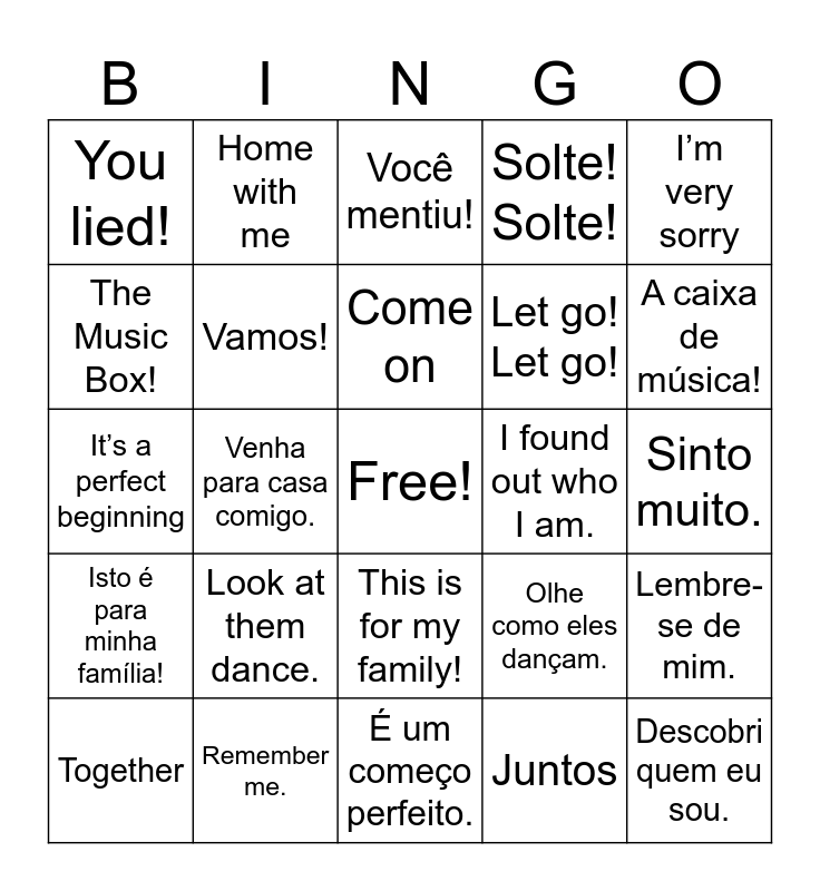 This bingo card has a free space and 24 words: Look at them dance., Remember me., Come on, Together, I’m very sorry, You lied!, The Music Box!, Home with me, I found out who I am., This is for my family!, Let go! Let go!, It’s a perfect beginning, Olhe como eles dançam., Lembre-se de mim., Vamos!, Juntos, Sinto muito., Você mentiu!, A caixa de música!, Venha para casa comigo., Descobri quem eu sou., Isto é para minha família!, Solte! Solte! and É um começo perfeito..