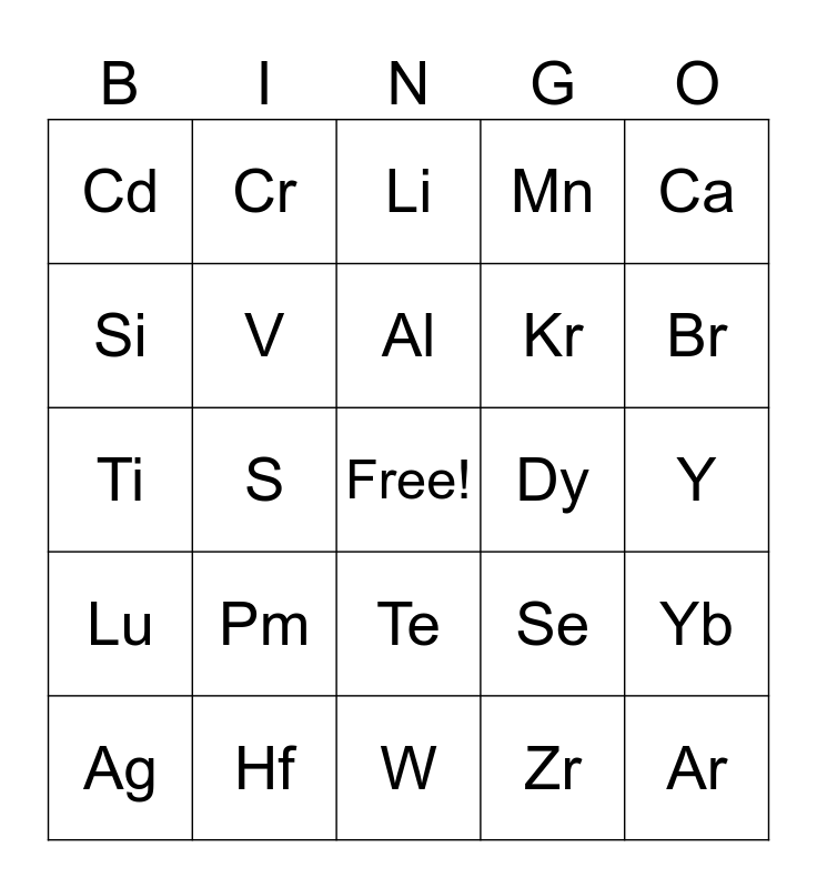 This bingo card has a free space and 75 words: H, He, Li, Be, B, C, N, O, F, Ne, Na, Mg, Al, Si, P, S, Cl, Ar, K, Ca, Sc, Ti, V, Cr, Mn, Fe, Co, Ni, Cu, Zn, Ga, Ge, As, Se, Br, Kr, Rb, Sr, Y, Zr, Nb, Mo, Tc, Ru, Rh, Pd, Ag, Cd, In, Sn, Sb, Te, I, Xe, Cs, Ba, La, Ce, Pr, Nd, Pm, Sm, Eu, Gd, Tb, Dy, Ho, Er, Tm, Yb, Lu, Hf, Ta, W and Re.