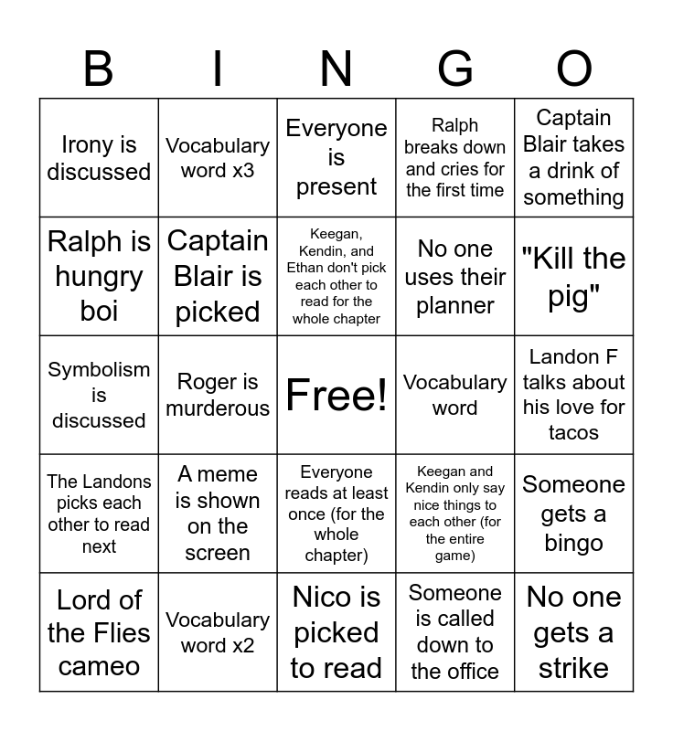 This bingo card has a free space and 29 words: Lord of the Flies cameo, Ralph is betrayed, Roger is murderous, The very first alive adult shows up, Irony is discussed, Everyone is present, Captain Blair is picked, A meme is shown on the screen, Vocabulary word, Vocabulary word x2, Landon F talks about his love for tacos, No one gets a strike, Nico is picked to read, Someone is called down to the office, "Kill the pig", Kendin is picked to read, Everyone reads at least once (for the whole chapter), The Landons picks each other to read next, Captain Blair takes a drink of something, Symbolism is discussed, Keegan and Kendin only say nice things to each other (for the entire game), Kaylee is picked to read, No one uses their planner, Ralph is hungry boi, Ralph breaks down and cries for the first time, Vocabulary word x3, Someone gets a bingo, Keegan, Kendin, and Ethan don't pick each other to read for the whole chapter and Three A names are picked to read in a row.