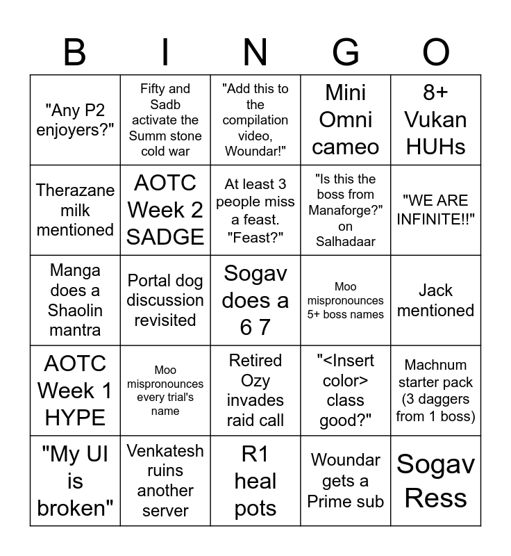 This bingo card has a free space and 24 words: Moo mispronounces every trial's name, Venkatesh ruins another server, At least 3 people miss a feast. "Feast?", "My UI is broken", 8+ Vukan HUHs, "Any P2 enjoyers?", Therazane milk mentioned, Fifty and Sadb activate the Summ stone cold war, Moo mispronounces 5+ boss names, Retired Ozy invades raid call, "Is this the boss from Manaforge?" on Salhadaar, Manga does a Shaolin mantra, "<Insert color> class good?", Machnum starter pack (3 daggers from 1 boss), AOTC Week 2 SADGE, Woundar gets a Prime sub, Jack mentioned, "Add this to the compilation video, Woundar!", "WE ARE INFINITE!!", Portal dog discussion revisited, Sogav Ress, AOTC Week 1 HYPE, Mini Omni cameo and R1 heal pots.