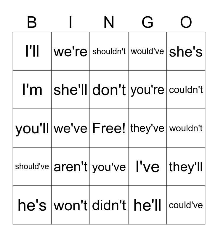 This bingo card has a free space and 24 words: aren't, won't, don't, he's, she's, I'll, I'm, we're, they've, you've, you're, you'll, I've, they'll, she'll, he'll, wouldn't, shouldn't, couldn't, we've, could've, should've, would've and didn't.