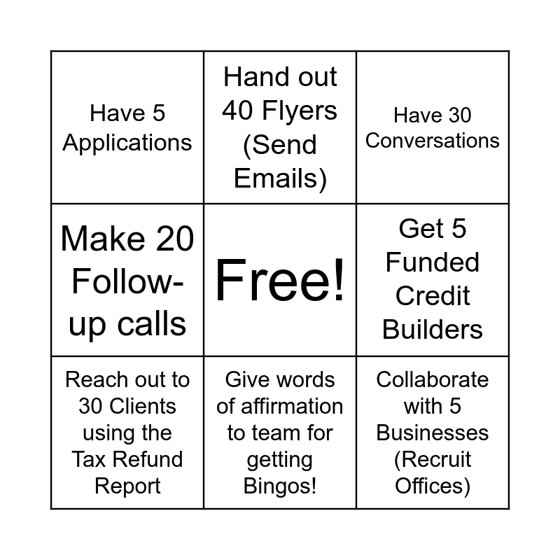 This bingo card has a free space and 8 words: Get 5 Funded Credit Builders, Have 30 Conversations, Hand out 40 Flyers (Send Emails), Reach out to 30 Clients using the Tax Refund Report, Have 5 Applications, Collaborate with 5 Businesses (Recruit Offices), Make 20 Follow-up calls and Give words of affirmation to team for getting Bingos!.